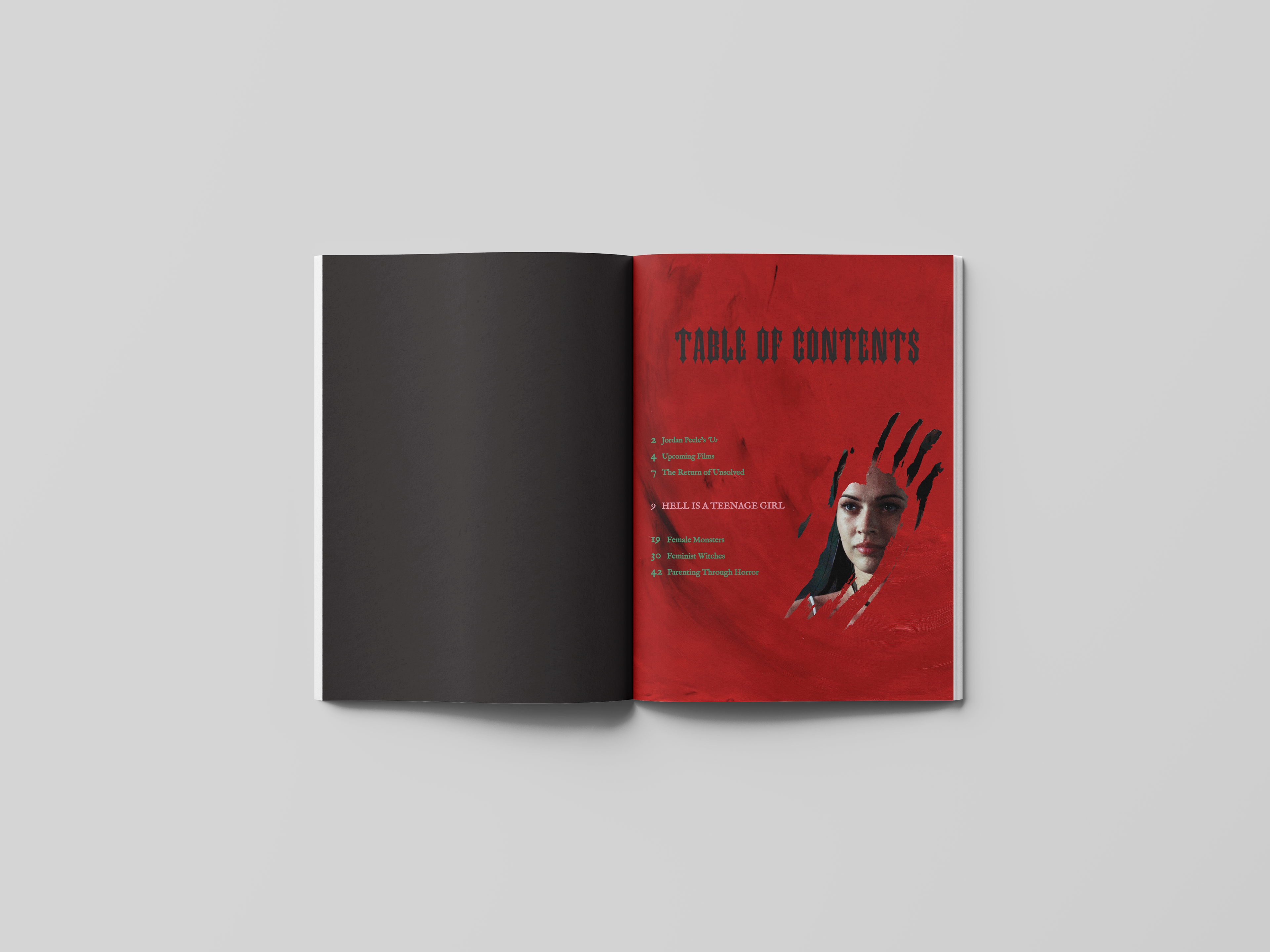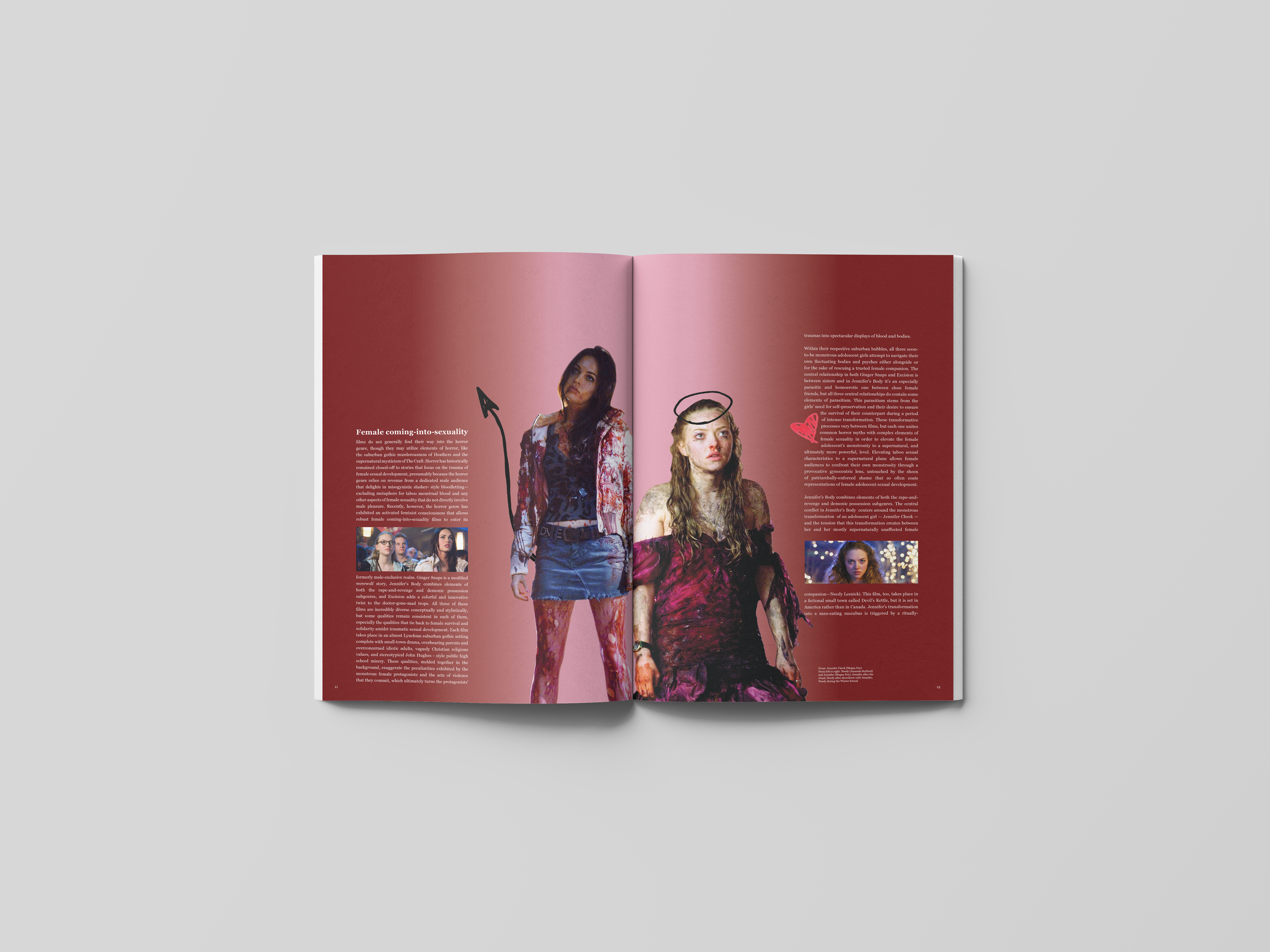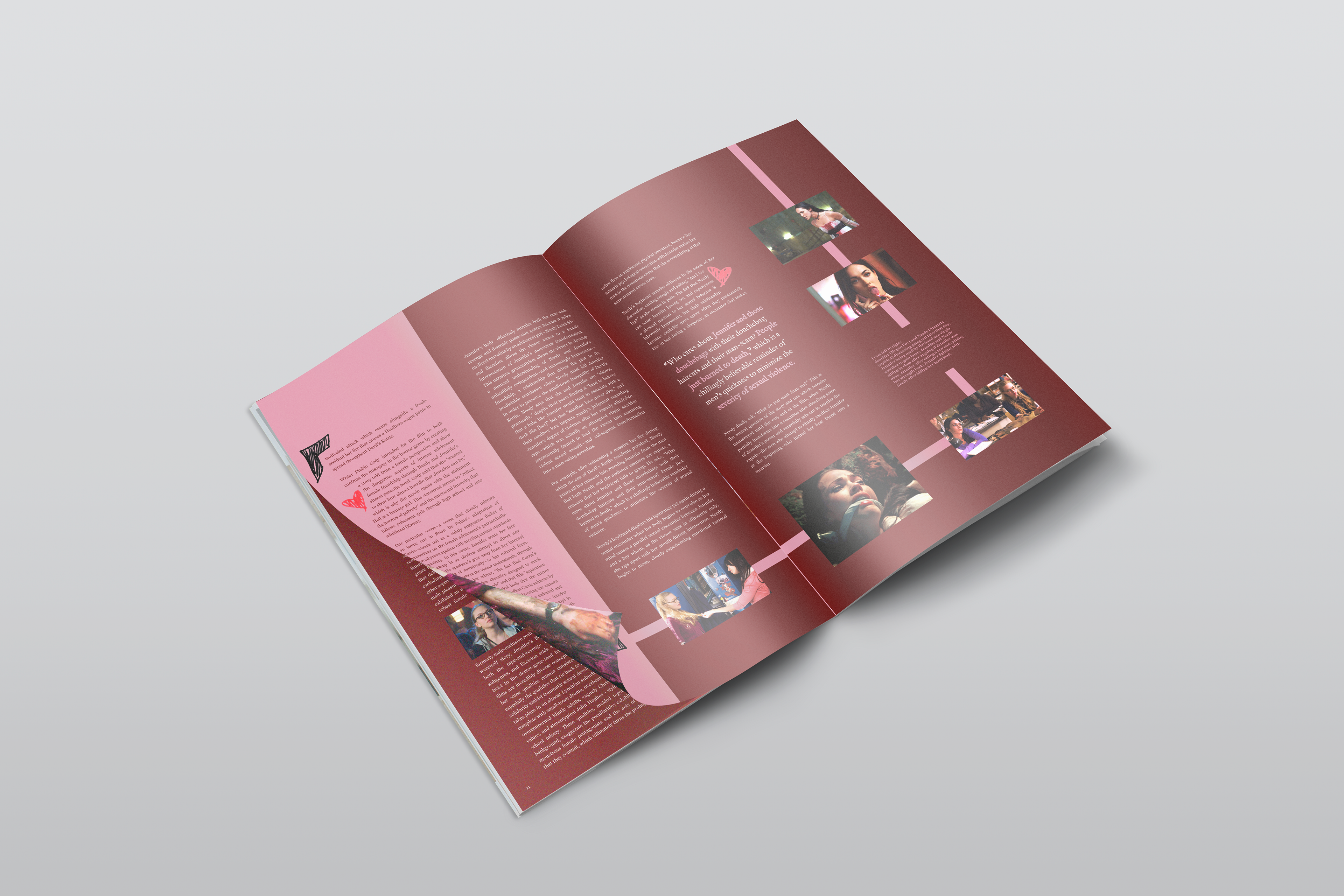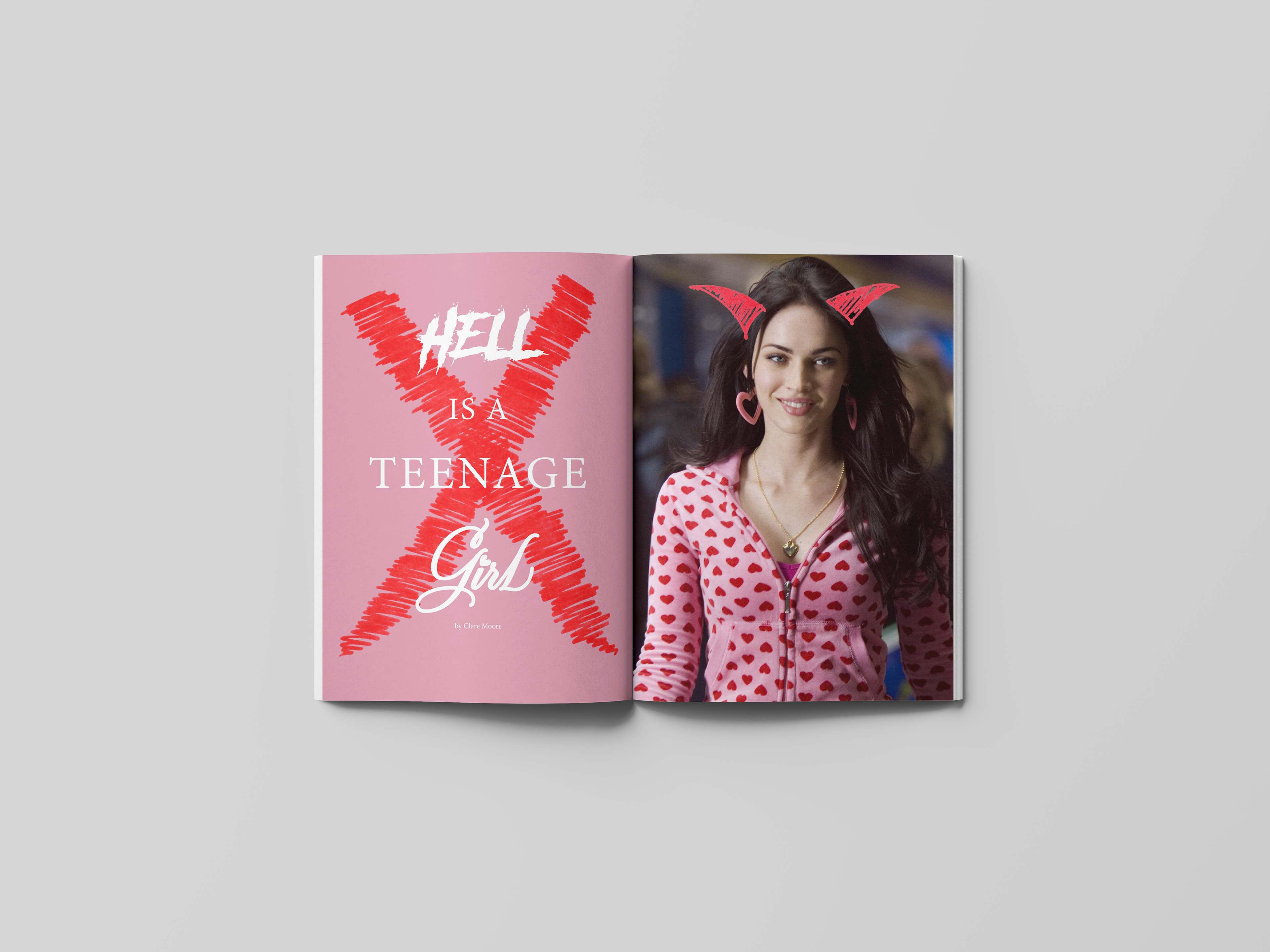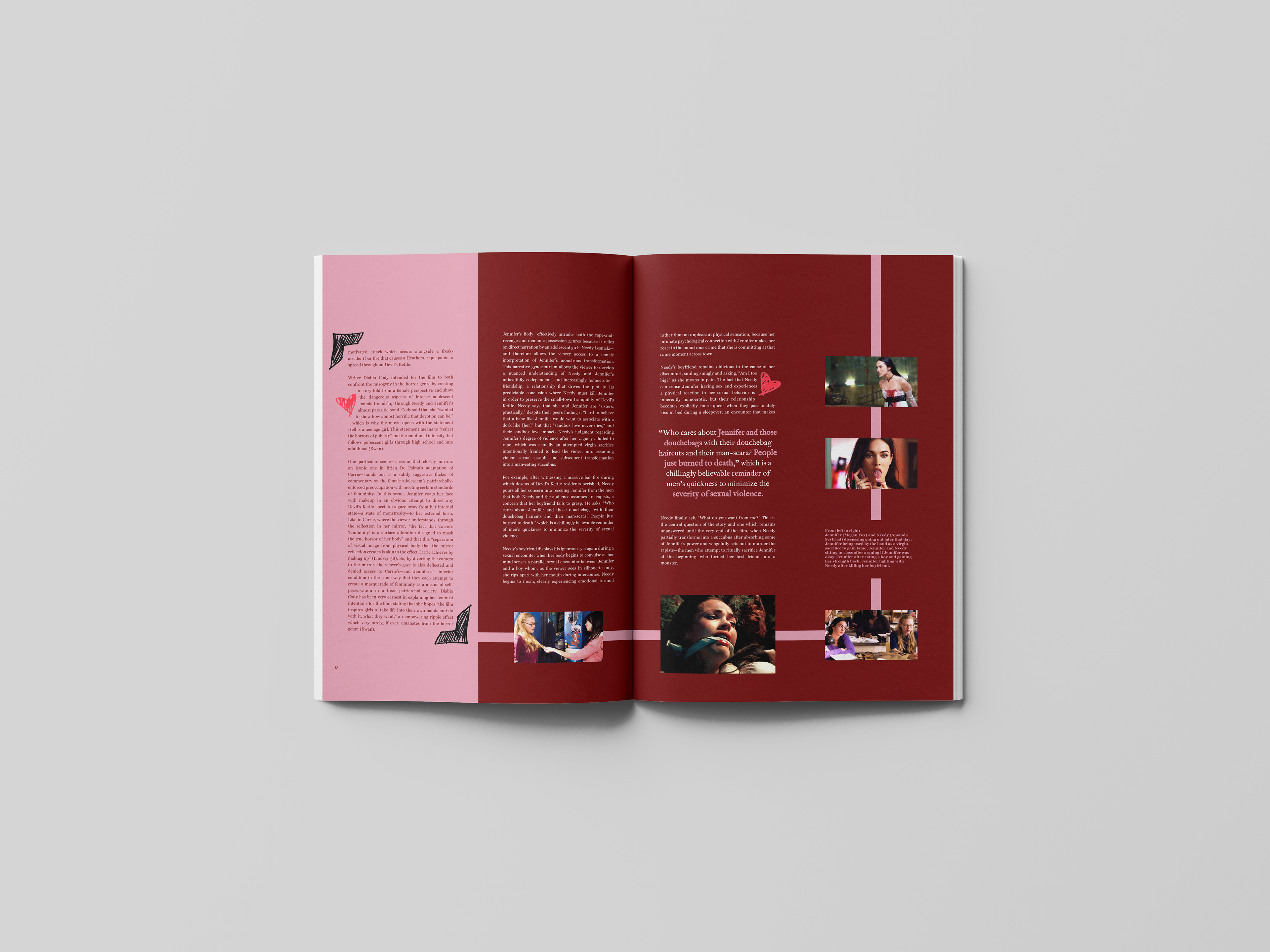 Scream magazine is a publication dedicated to all things horror, specializing in film and tv. When picking a subject matter, I knew I wanted this issue of the magazine to be dedicated to women. I specifically wanted to appeal to that gender demographic as horror is commonly believed to be more male centric. I designed the spreads of the article "Hell is a Teenage Girl" to represent the feel and voice of the film. Jennifer’s Body (2009) is a campy dark comedy so to connect the article to the design, I used pink - a color commonly used in the cast's wardrobe - for the campy mood and then I chose red for blood. I drew small illustrations for the characters, giving an idea of their role in the film (i.e., halo for angel and tale for devil). For the final touch, I had hearts scattered throughout the article, referencing back to a certain shot in the movie where Jennifer draws hearts on the boys she will claim as her victims.